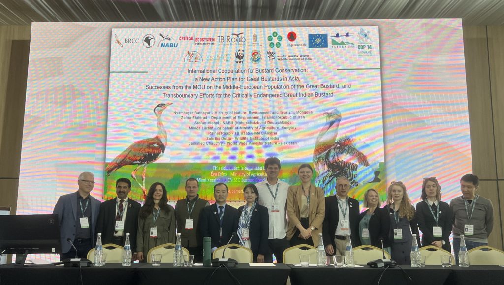 A side event, “International Cooperation for Bustard Conservation“, co-organized by the Eurasian Bustard Alliance and the Ministry of Agriculture of Hungary, and supported by the Swiss Ornithological Institute, was one of the best-attended events at the COP. The panel united speakers to present on transboundary efforts to conserve bustards in eight countries: Austria, Hungary, India, Iran, Kazakhstan, Mongolia, Pakistan and Uzbekistan.